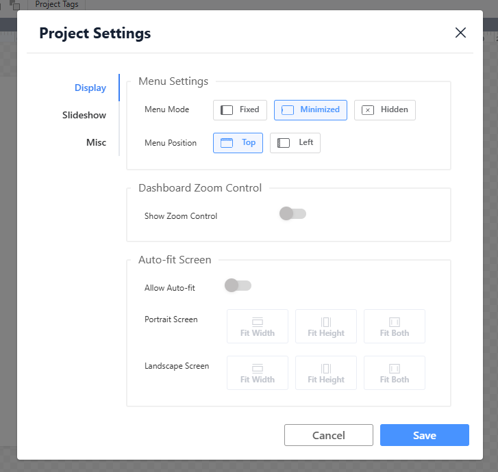 - Description: Specifies where the main navigation menu (such as screen/slideshow switching, settings, and action buttons) appears on the screen (e.g., top, left sidebar, bottom).