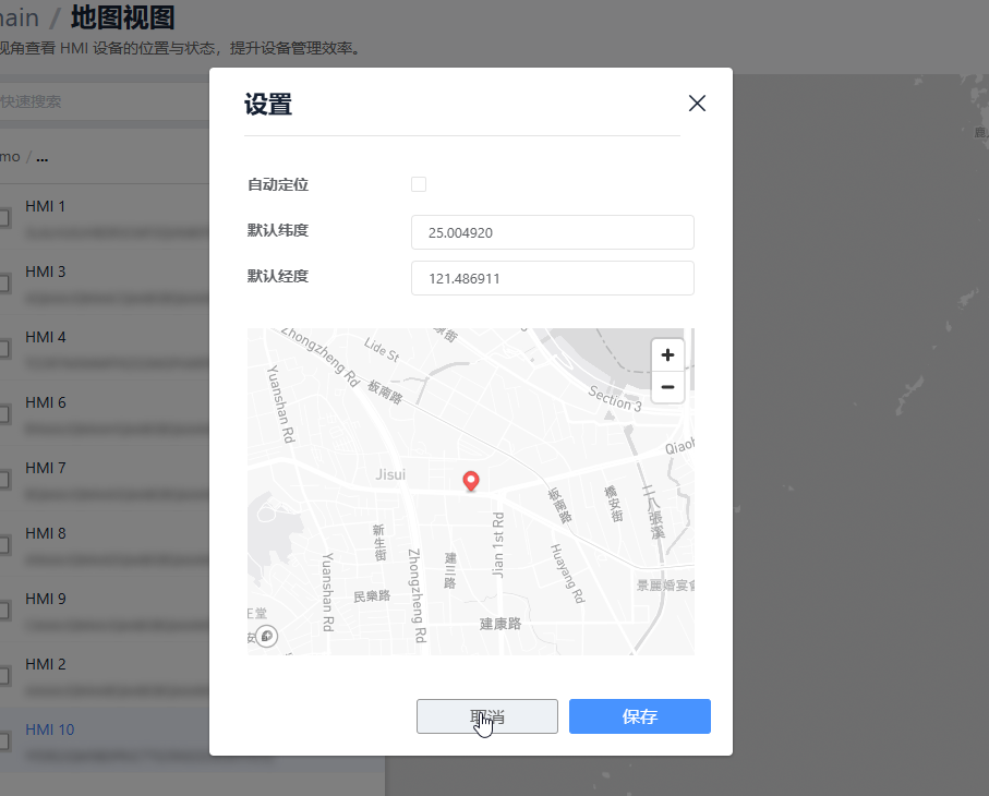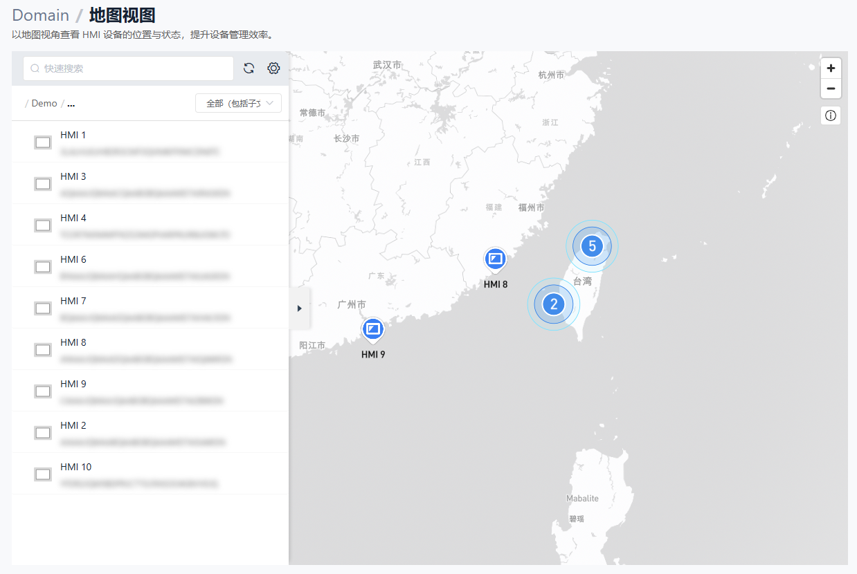 地图是此页面的内核区域,显示所有已设置经纬度座标的 HMI 设备。这有助于管理员快速识别设备的地理分布。