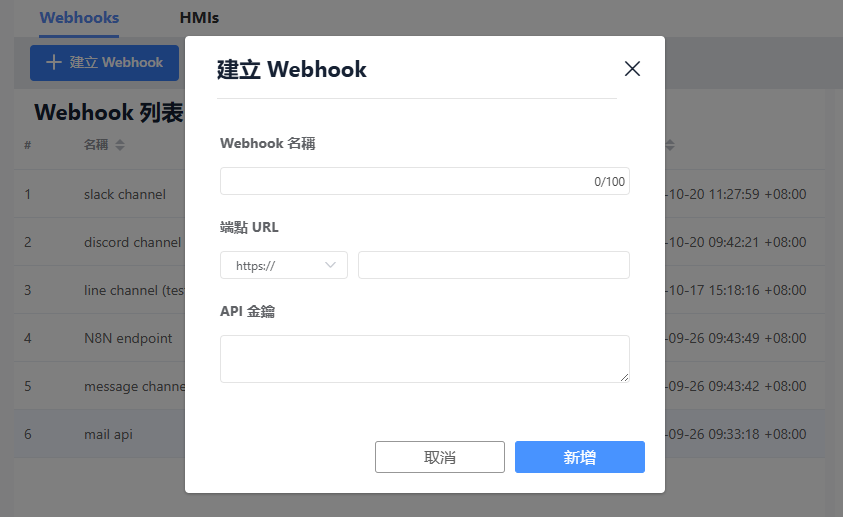 | 綁定 HMI | 可設定此 Webhook 訂閱哪些 HMI 設備的事件通知。 |